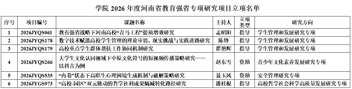 近日,中共河南省委教育工作委员会、河南省教育厅联合发布了《关于公布2026年度河南省教育强省专项研究项目立项名单的通知》(豫教工委〔2025〕107号),正式公布了2026年度河南省教育强省专项研究项目的立项结果。学院共有6个项目成功获得立项,这些项目集中展示学院在学生管理和发展研究、青少年文化素养发展研究、安全管理研究、高校哲学社会科学高质量发展研究等教育强省专项研究中的扎实基础和综合实力。