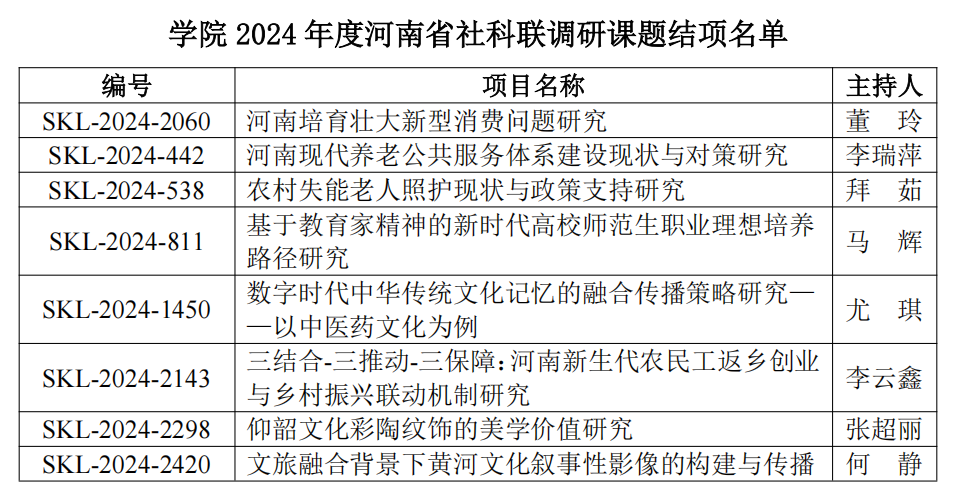 近日,根据《河南省社会科学界联合会关于2024年度调研课题评审情况的通知》(豫社科联字〔2025〕16号)、《河南省社会科学界联合会关于2025年度调研课题立项的通知》(豫社科联字〔2025〕17号),学院在2024年度调研课题结项评审和2025年调研课题立项评审中收获颇丰。以“8项结项+12项立项”的成绩,彰显了学院在社科研究领域的扎实实力与创新活力。